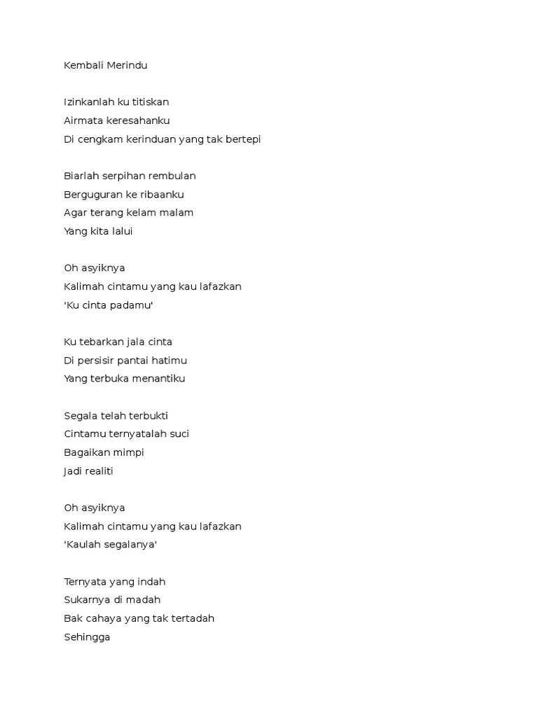 Dicengkam kerinduan yang tak bertepi. Intro Ab Bb Ab Ab Bb Ab Bb Ab Bb Cm Izinkanlah ku titiskan Bb Airmata keresahanku Eb Cm. Kembali Merindu Izinkanlah ku titiskan Airmata keresahanku Di cengkam kerinduan yang tak bertepi Biarlah serpihan rembulan Berguguran ke ribaanku Agar terang kelam malam Yang kita.